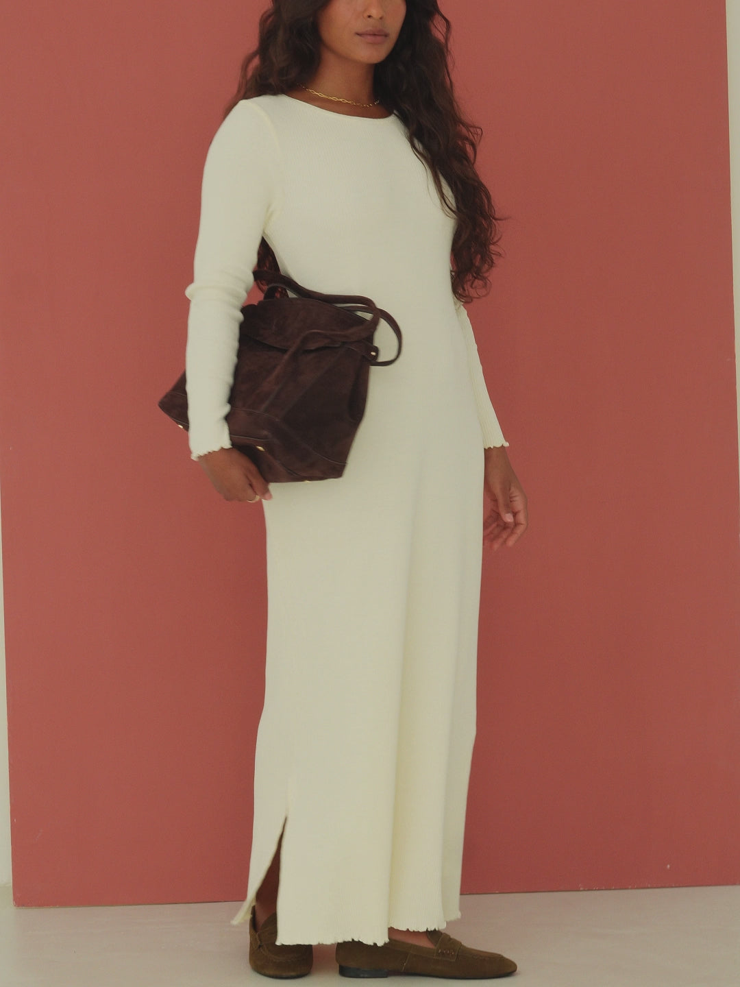 Timeless elegance meets comfort in the Ella Pearl Dress. Made from 100% organic cotton ribbed knit, this maxi-length dress features long sleeves and a sleek silhouette. It's  warm knit, it's comfortable for everyday wear.