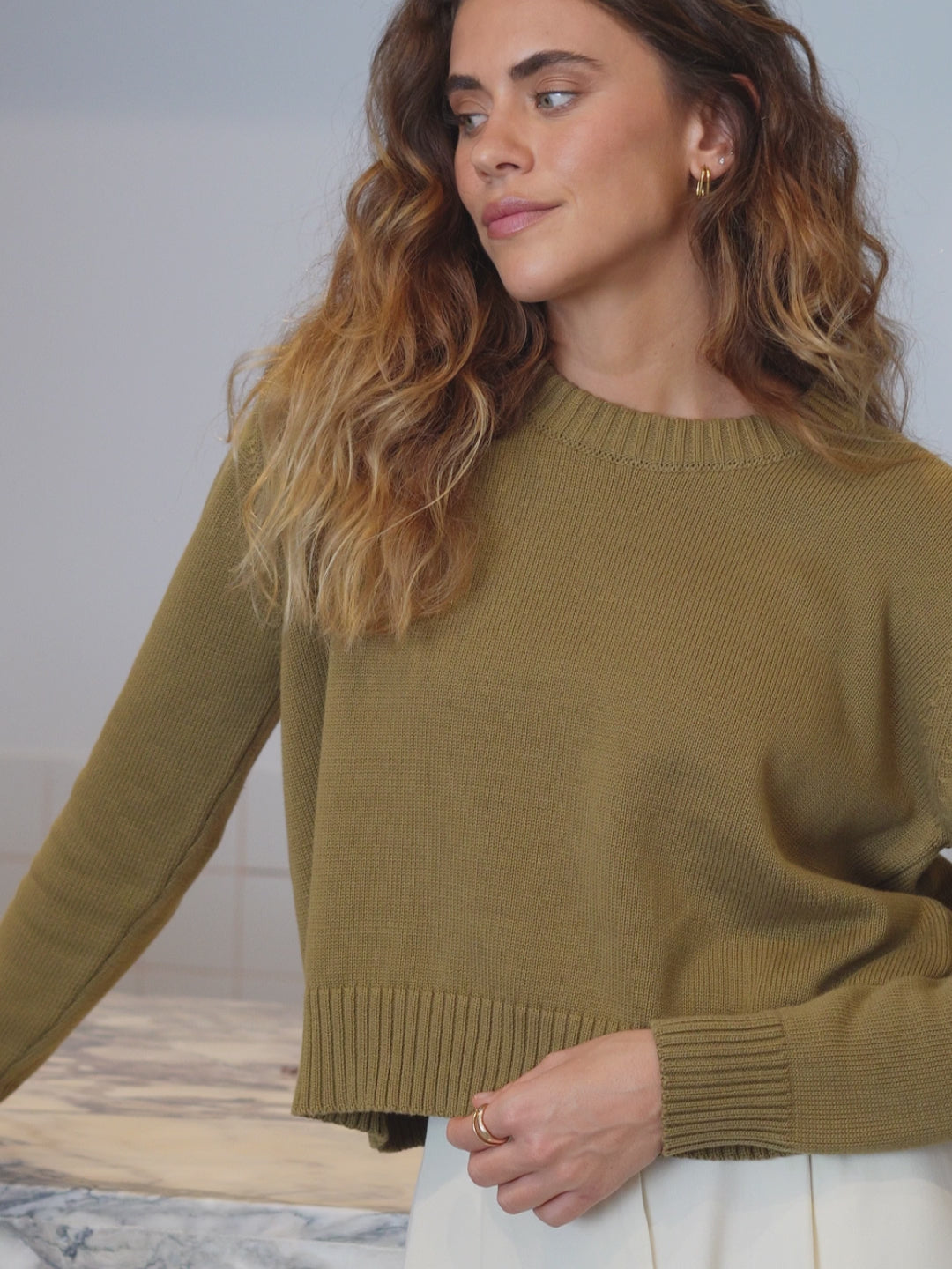 Meet your new go-to: the olive cotton crewneck jumper. With its oversized, cropped cut and classic neckline, it’s the kind of piece you’ll want to wear on repeat. The versatile olive color pairs easily with everyday basics, while the lightweight knit makes it ideal for transitional weather.